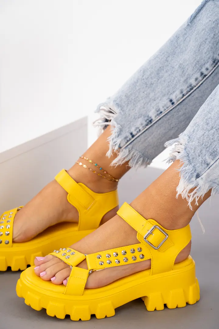 Sandały damskie na grubym spodzie z ćwiekami Żółte