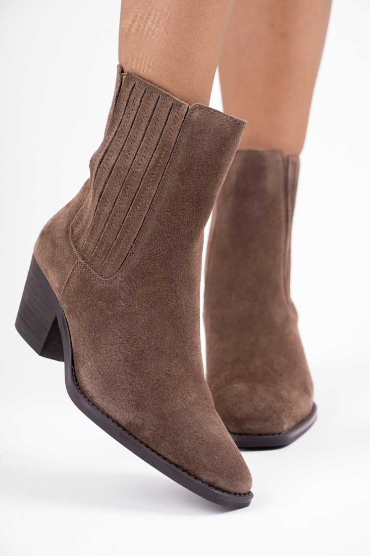 Sklep Skórzane brązowe botki na niskim obcasie z gumą na boku