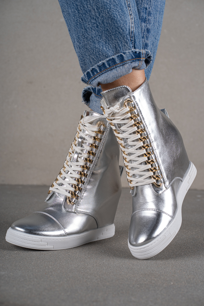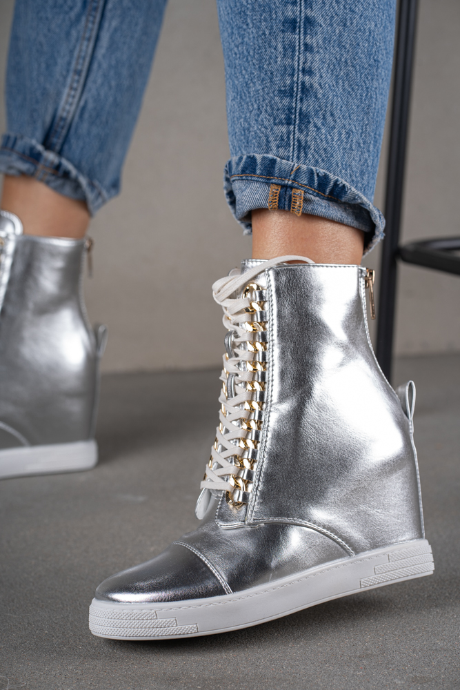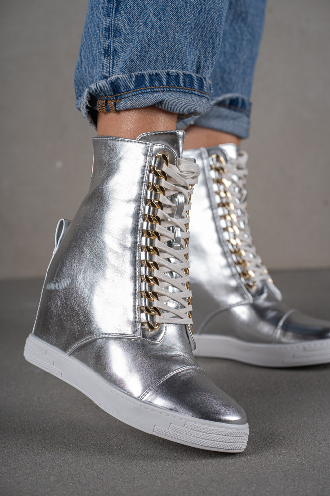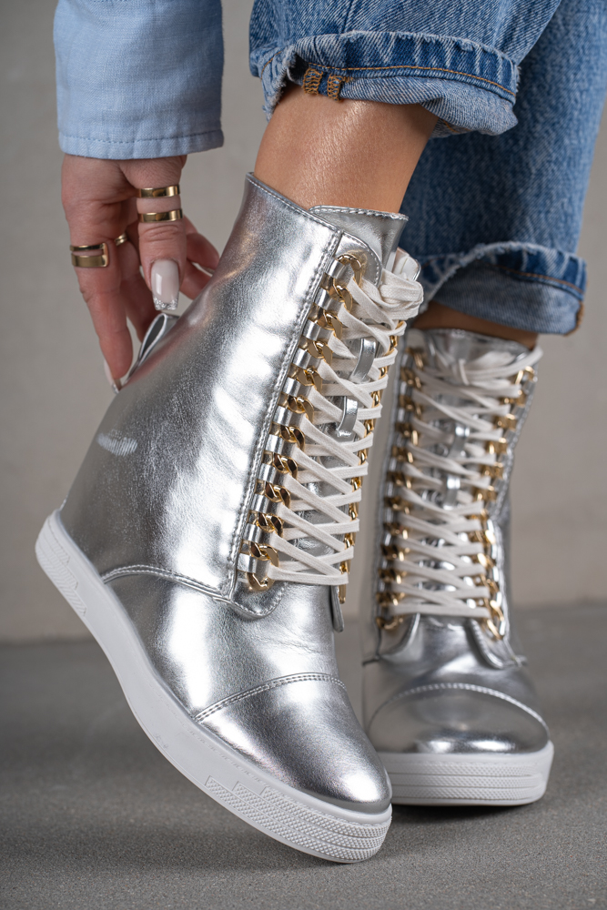 Srebrne sneakersy damskie na koturnie z złotymi wstawkami