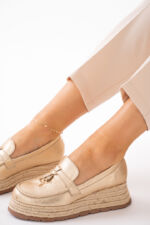 Złote zamszowe mokasyny damskie na plecionej podeszwie