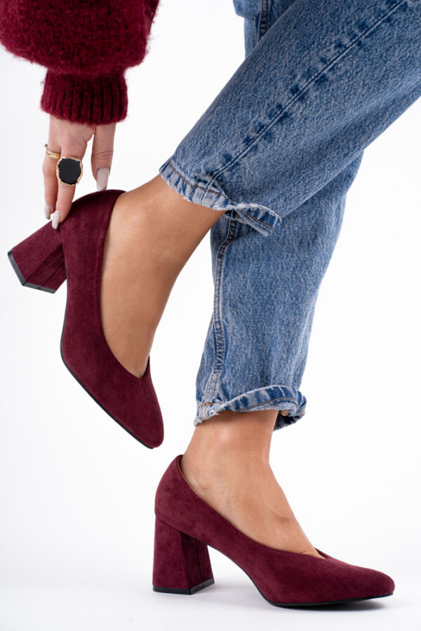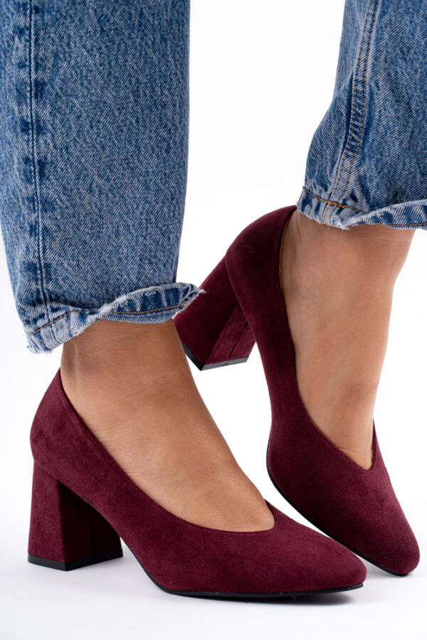 Bordowe zamszowe czółenka damskie na niskim obcasie z wycięciem