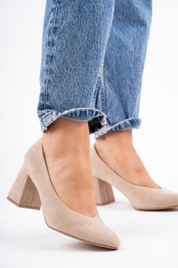 Beżowe zamszowe mokasyny damskie na obcasie z klamerką