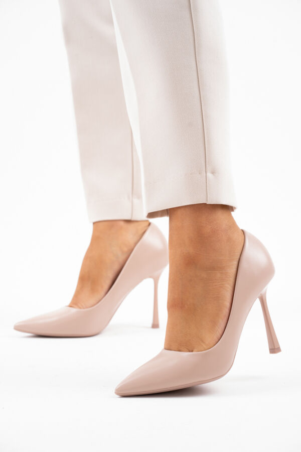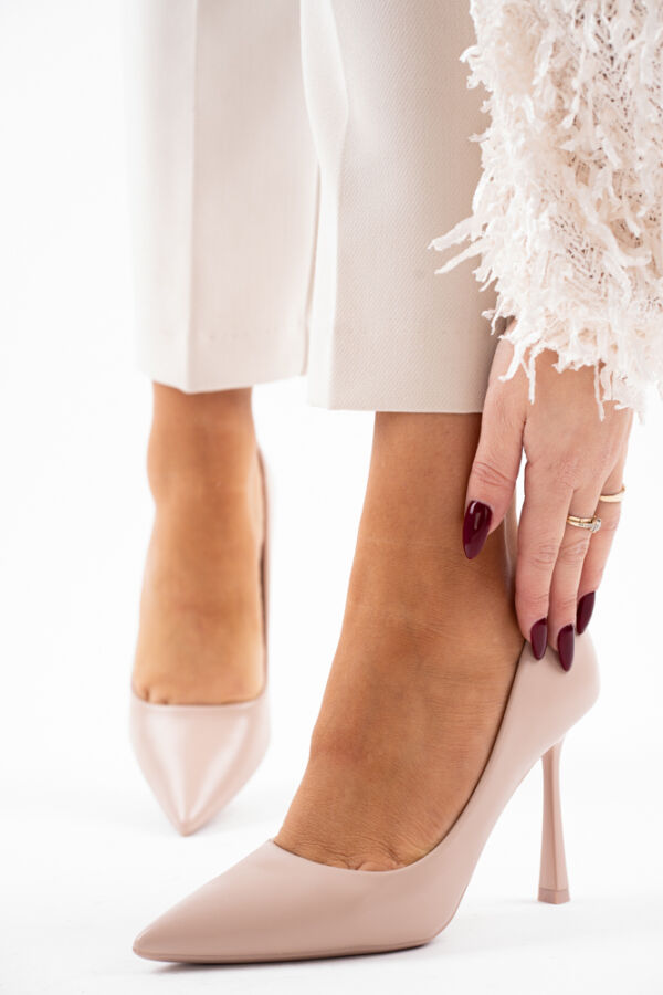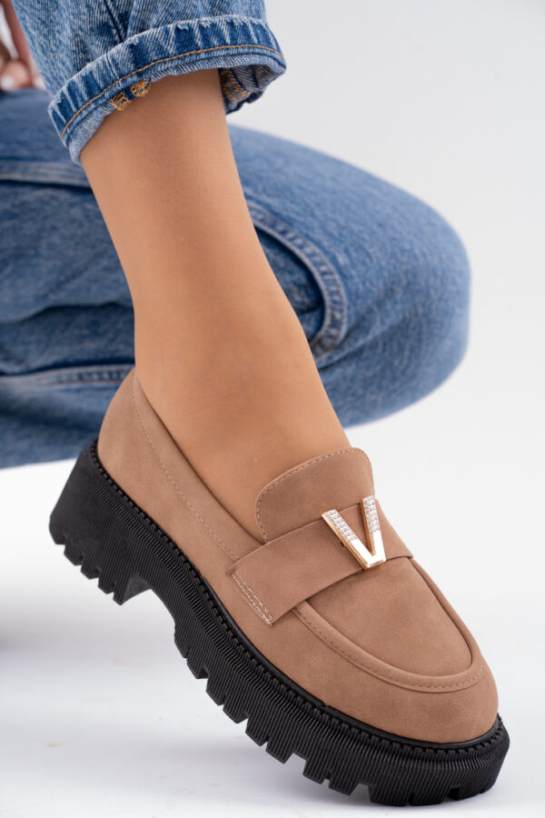 Beżowe mokasyny damskie na obcasie z złotym emblematem