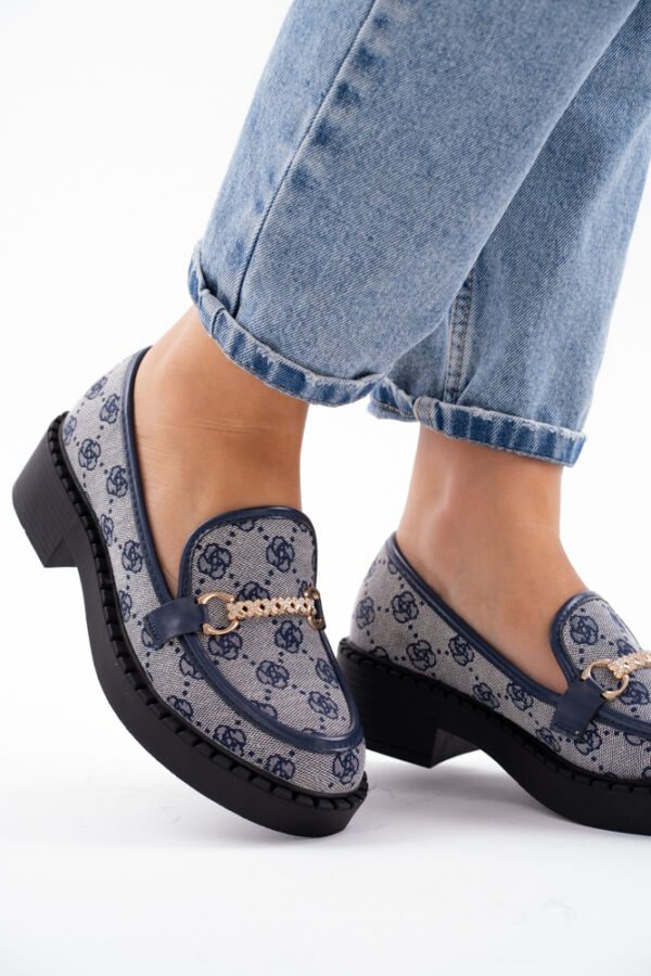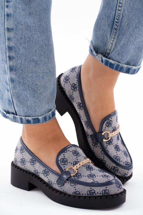 Niebieskie mokasyny damskie na płaskim spodzie z łańcuszkiem