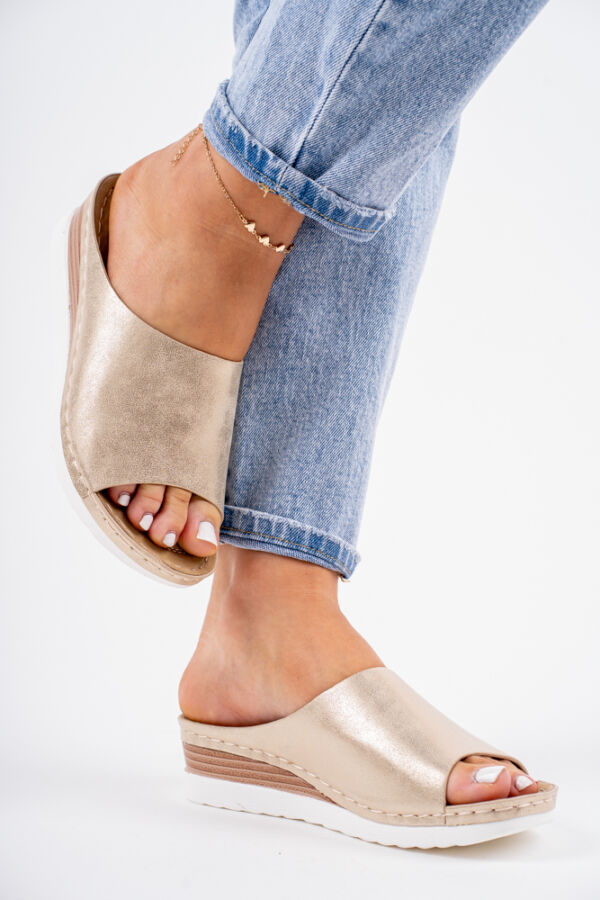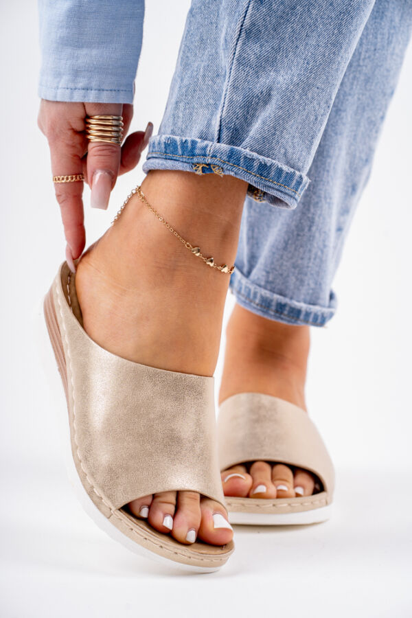 Złote klapki damskie na niskiej koturnie wsuwane