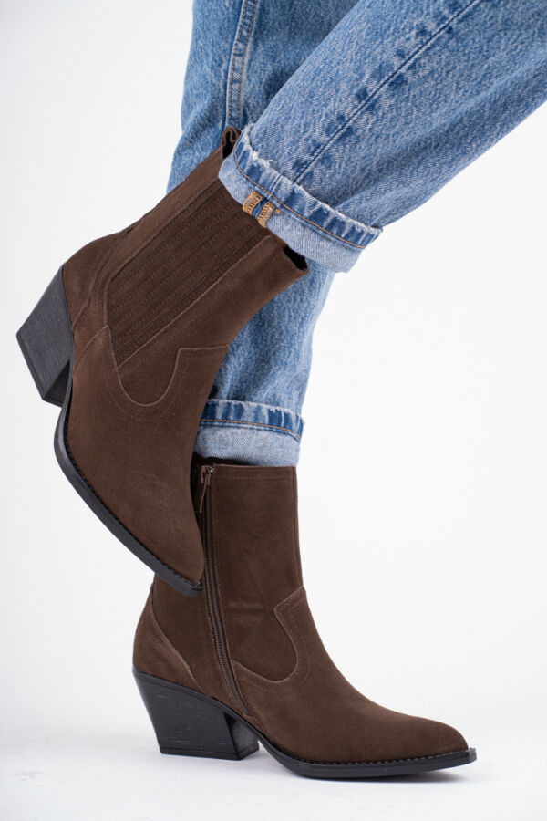 Czekoladowe kowbojki damskie na obcasie ze skóry Naturalnej
