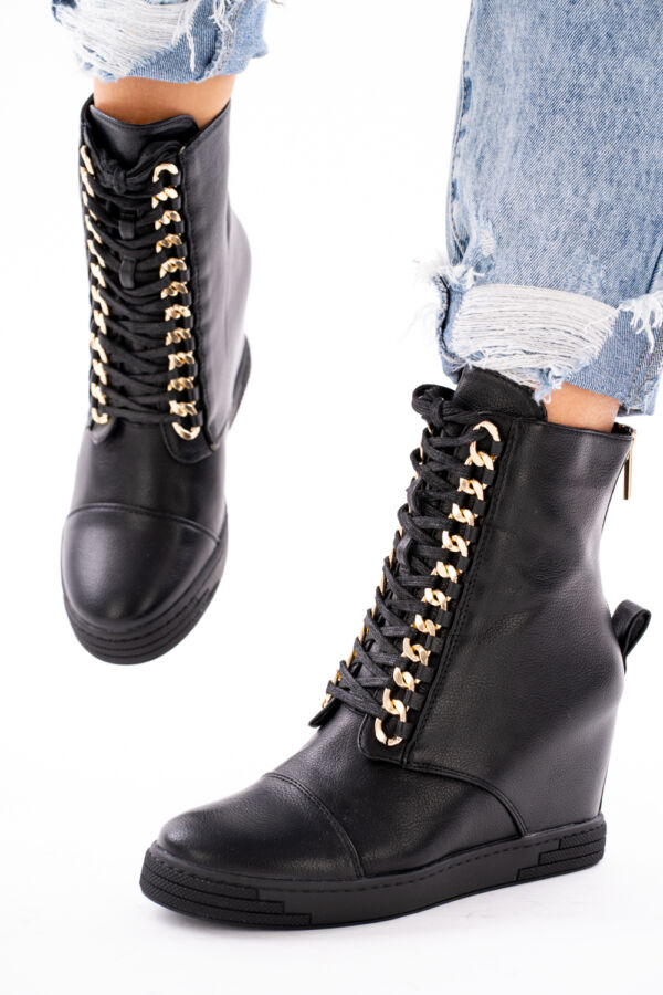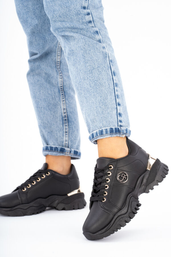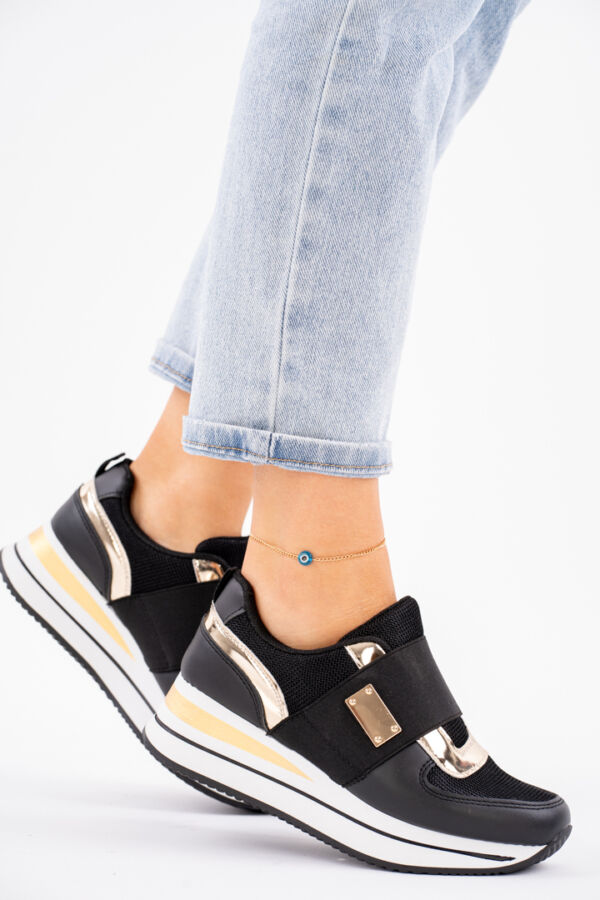 Czarne sneakersy damskie na koturnie z złotymi wstawkami